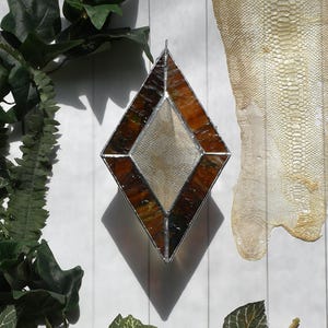 I drafted this design and cut each and every piece by hand. I then ground each piece to fit, foiled the edges, soldered the pieces together and then cleaned it up and attached a twisted copper wire to the stem for hanging. This piece has been finished with a black patina and a hard shell wax.