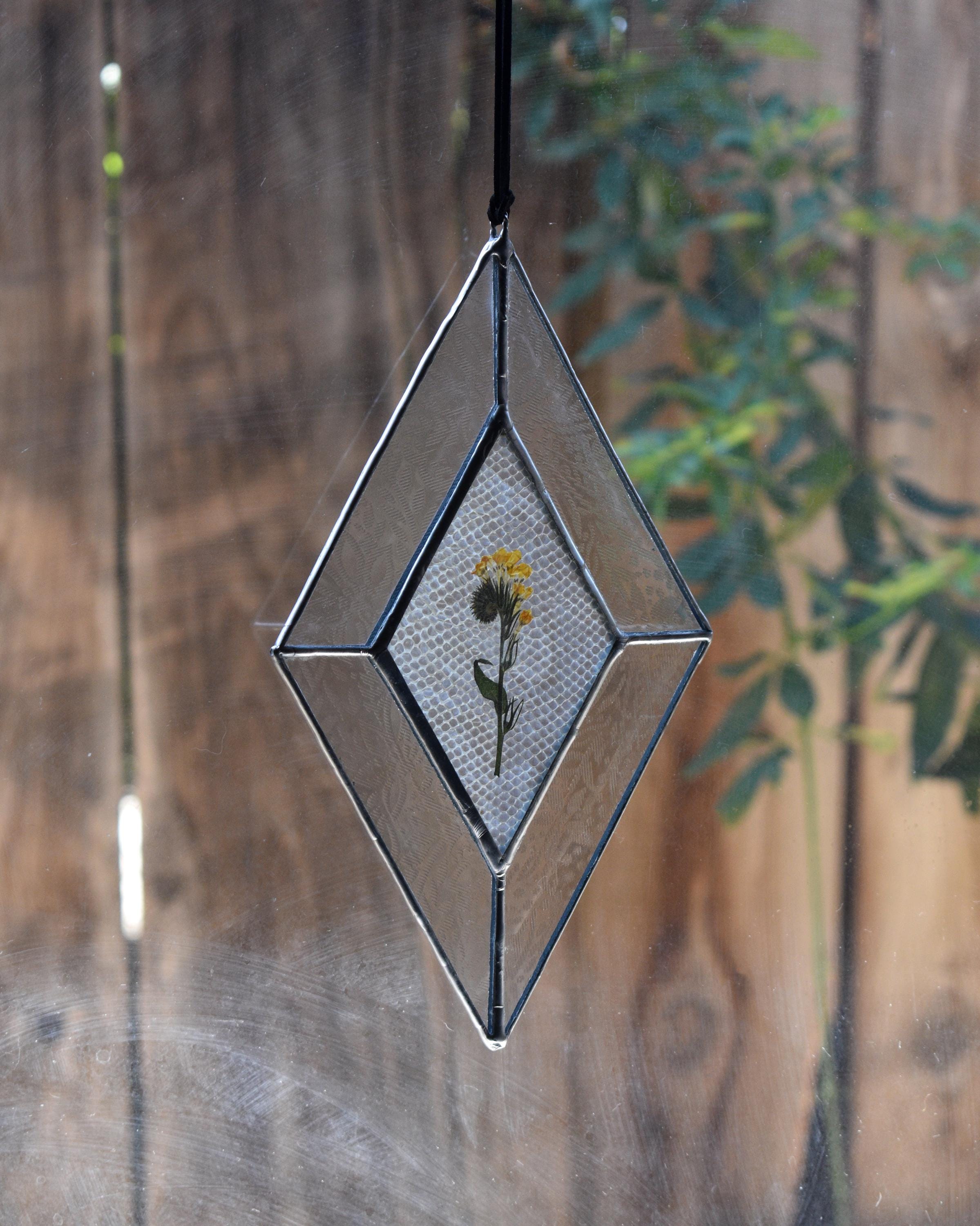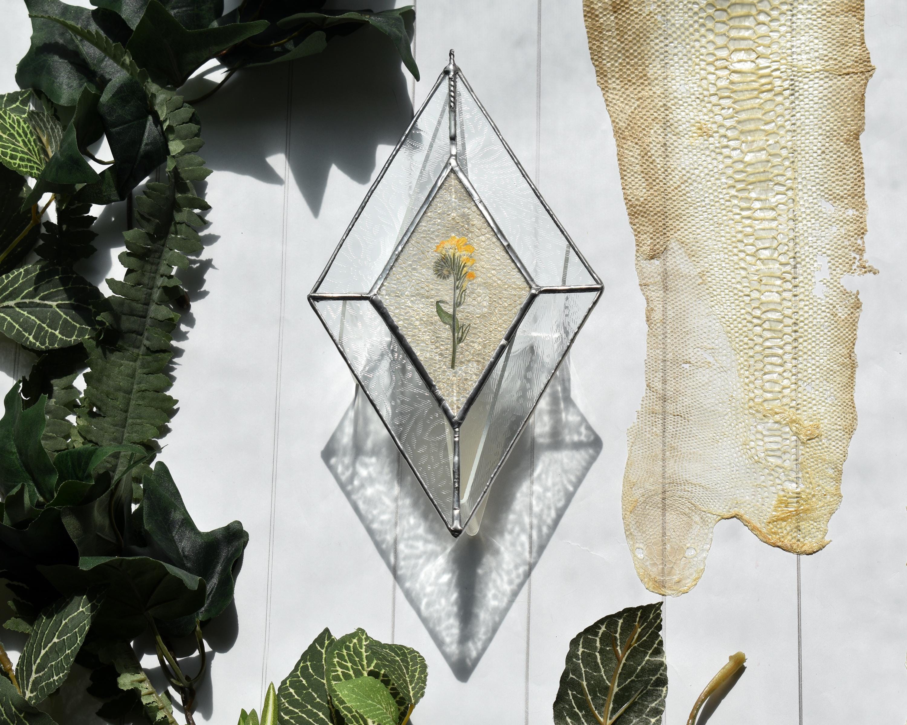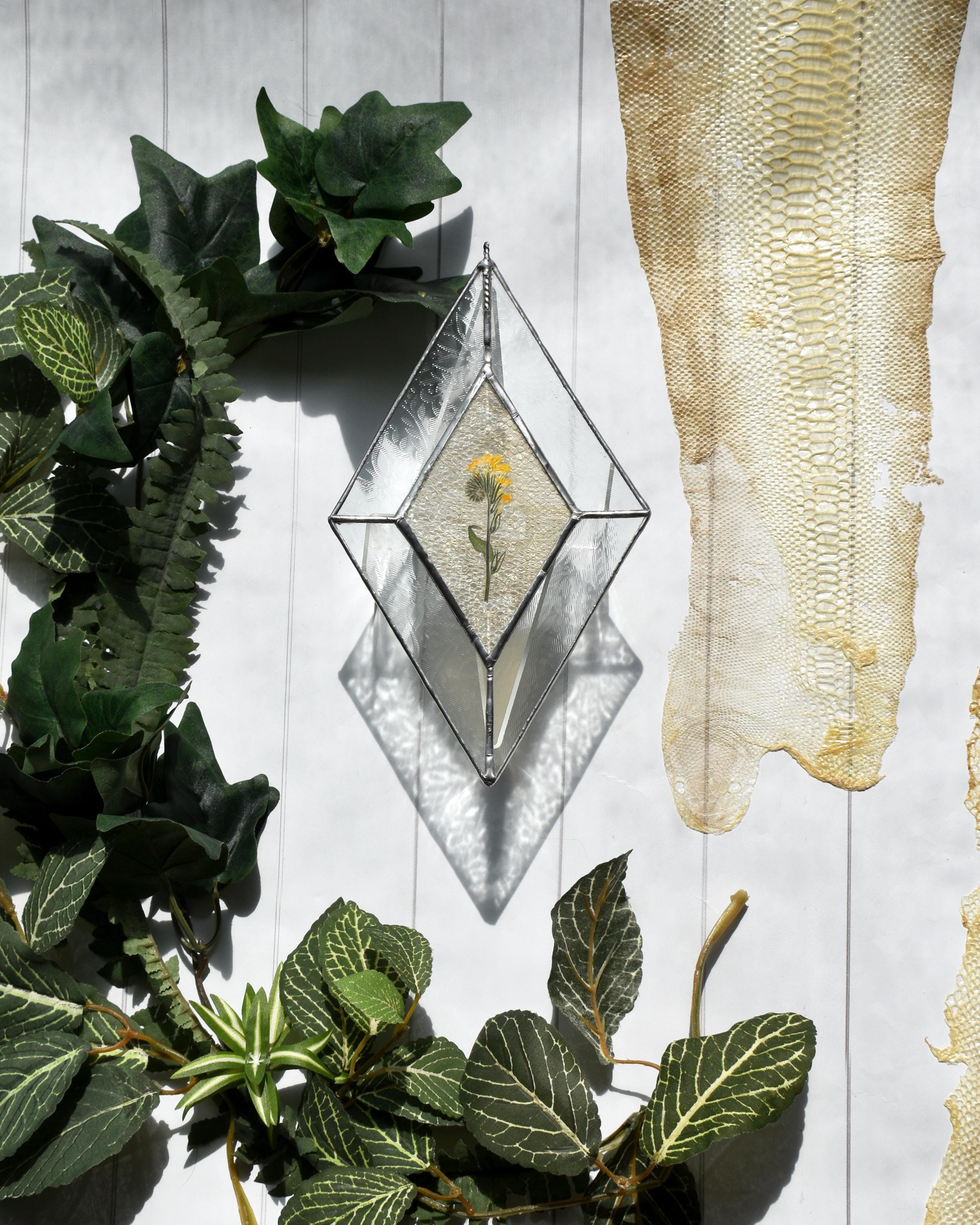 I hand picked the fiddleneck flower myself in Friant, CA, and obtained the dried snake skin sheds from a reptile rehabilitation facility. I had to rehydrate these snake sheds carefully and then unfurl and press them before I was able to use them in pressed pieces like this one.