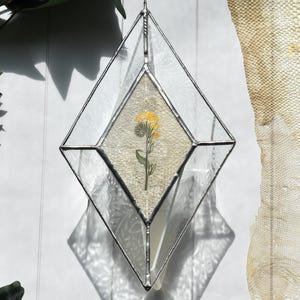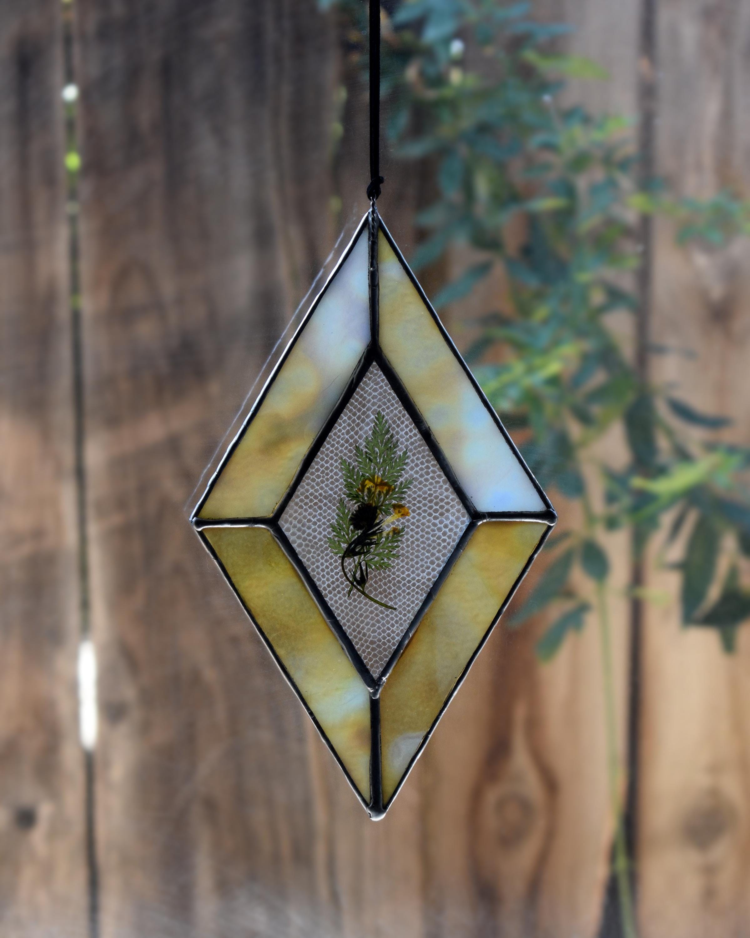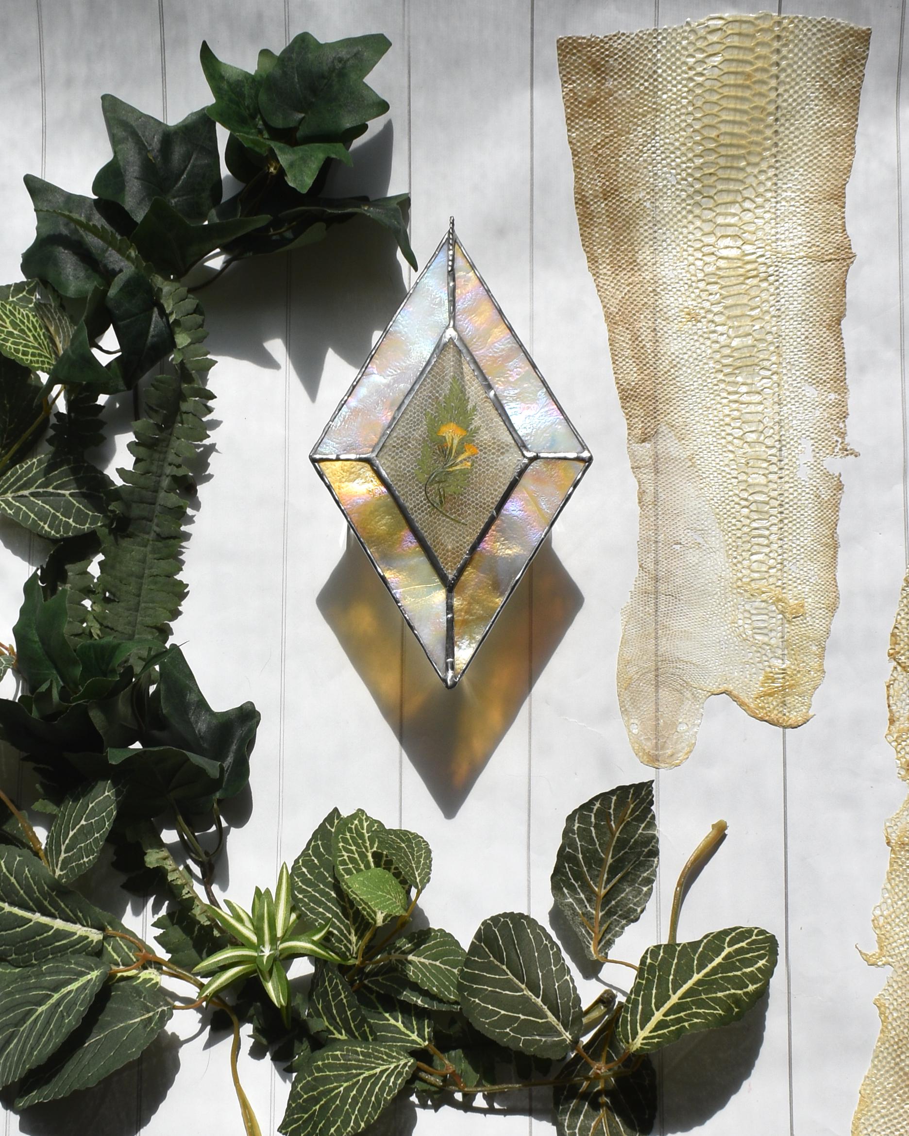 Pressed Yellow Fiddleneck Flower & Yarrow Leaf with Pressed Shed Snake Skin in Diamond Bevel with Iridescent Yellow and White Glass Frame