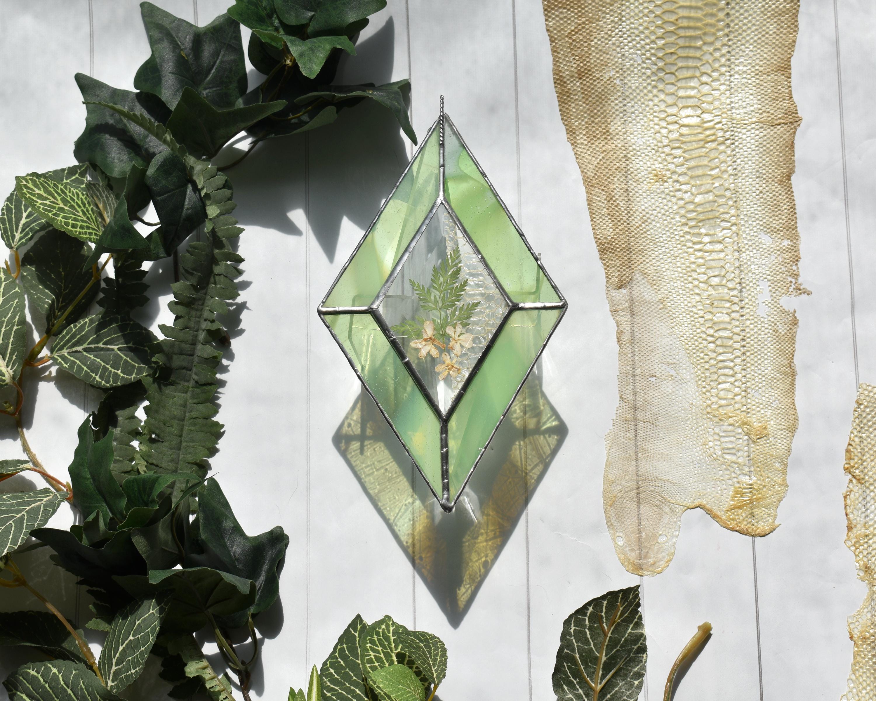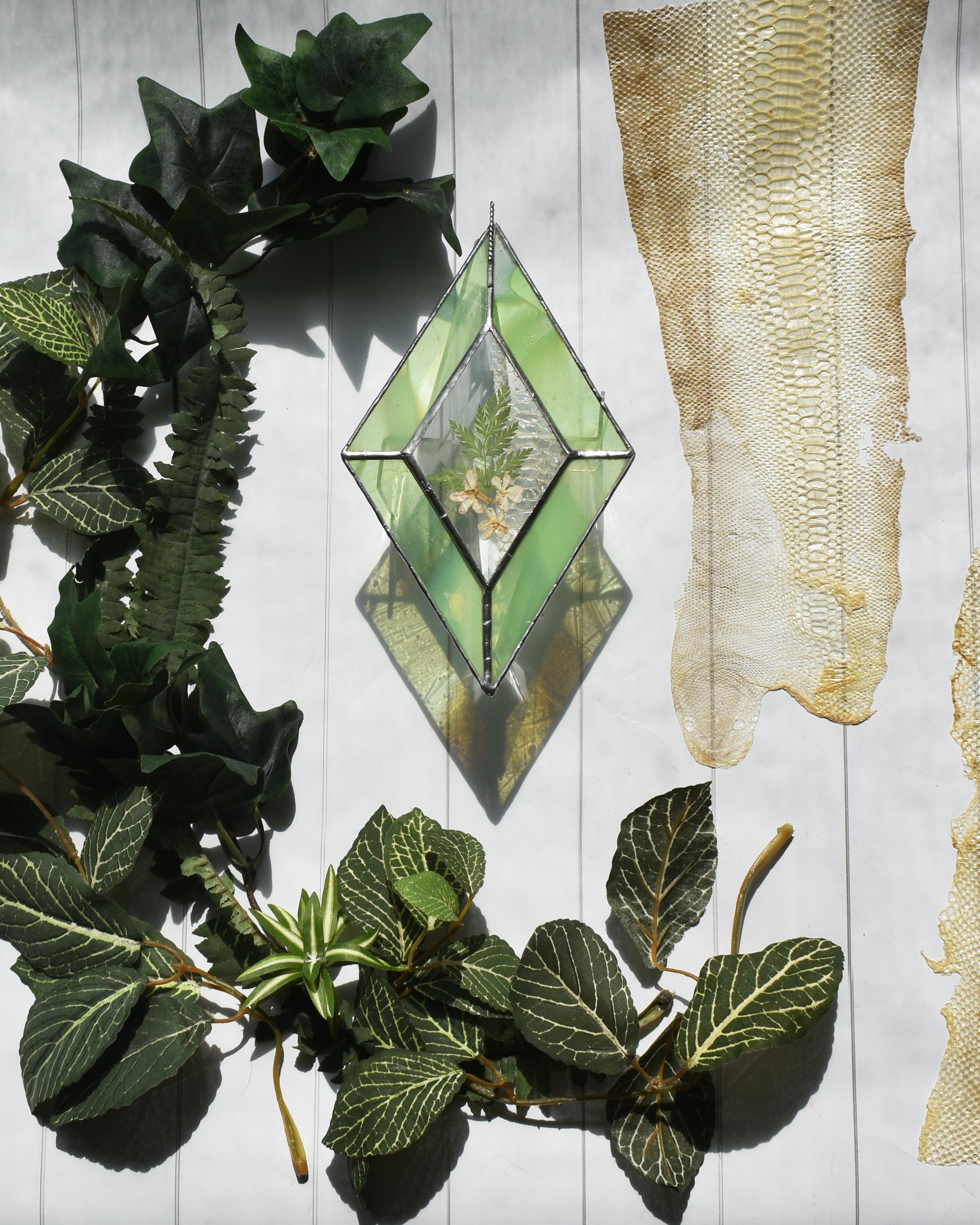 Pressed Lilac Flowers & Yarrow Leaf with Pressed Shed Snake Skin in Diamond Bevel with Green and White Frame
