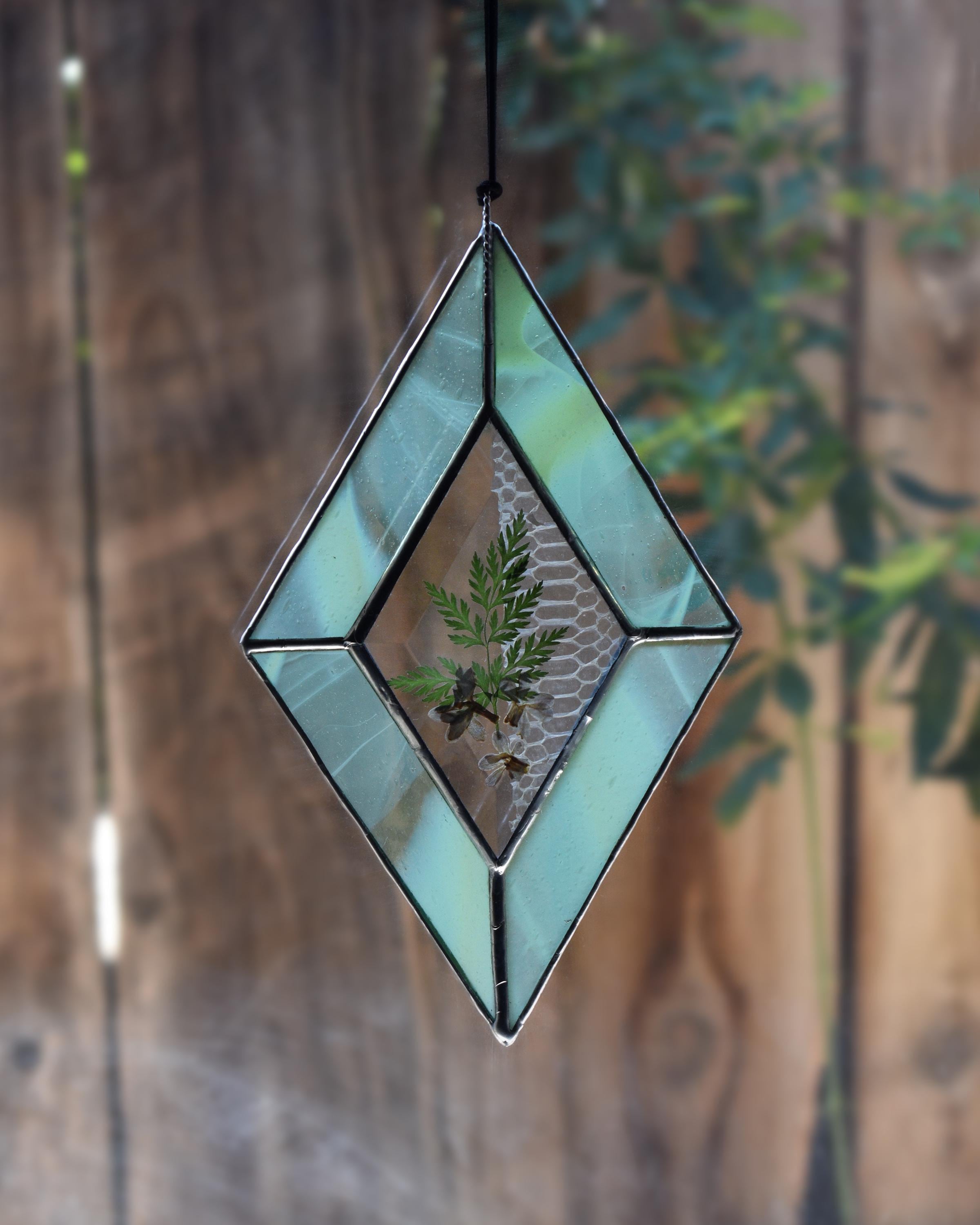 The glass used in the four frame pieces is a mouth-blown green and white mix with varying opacity throughout. some spots are almost fully opaque while others are see through.
