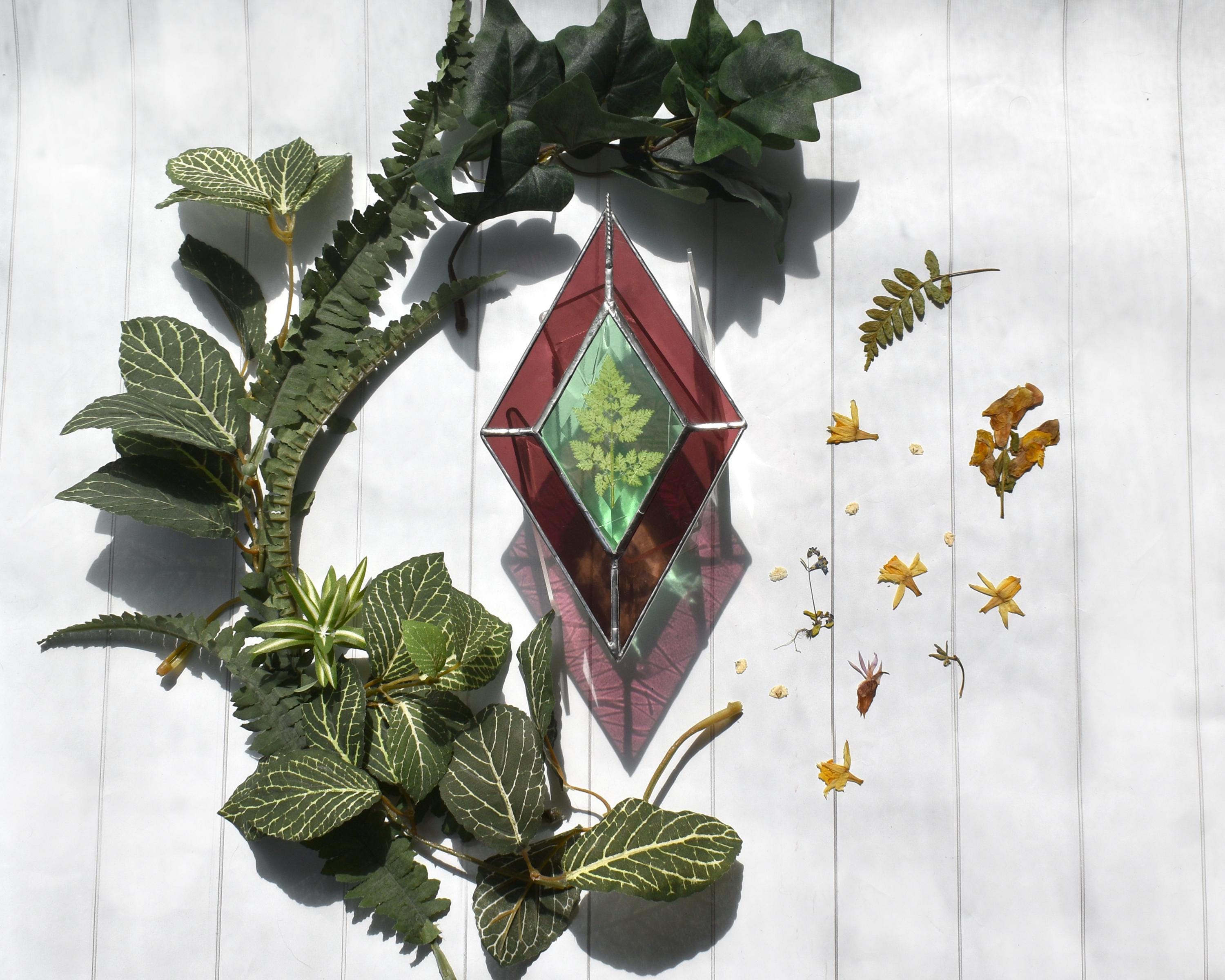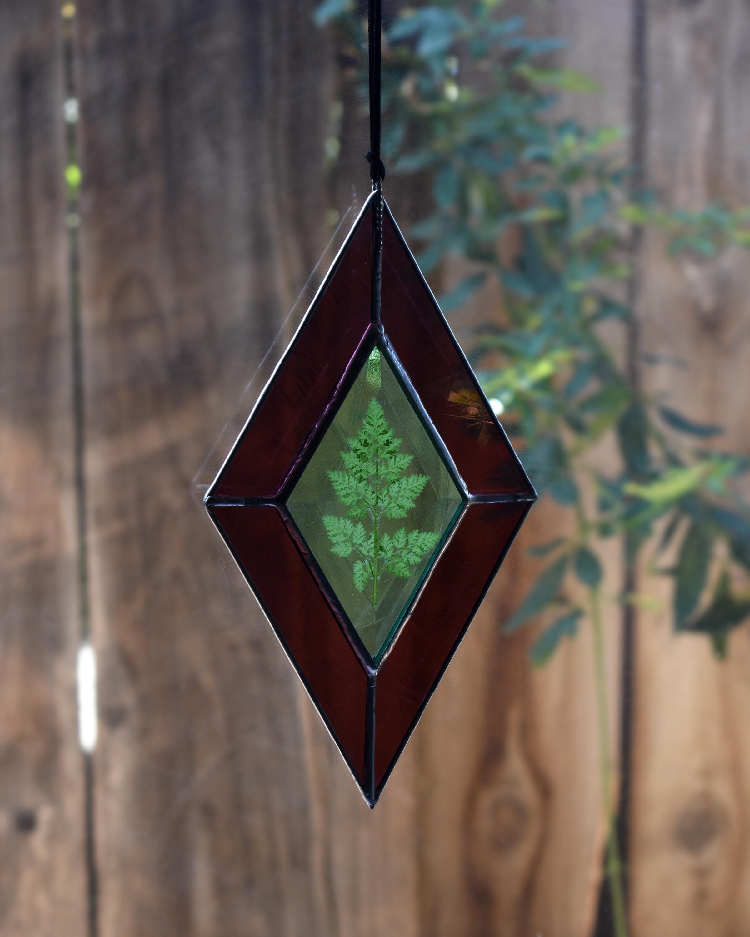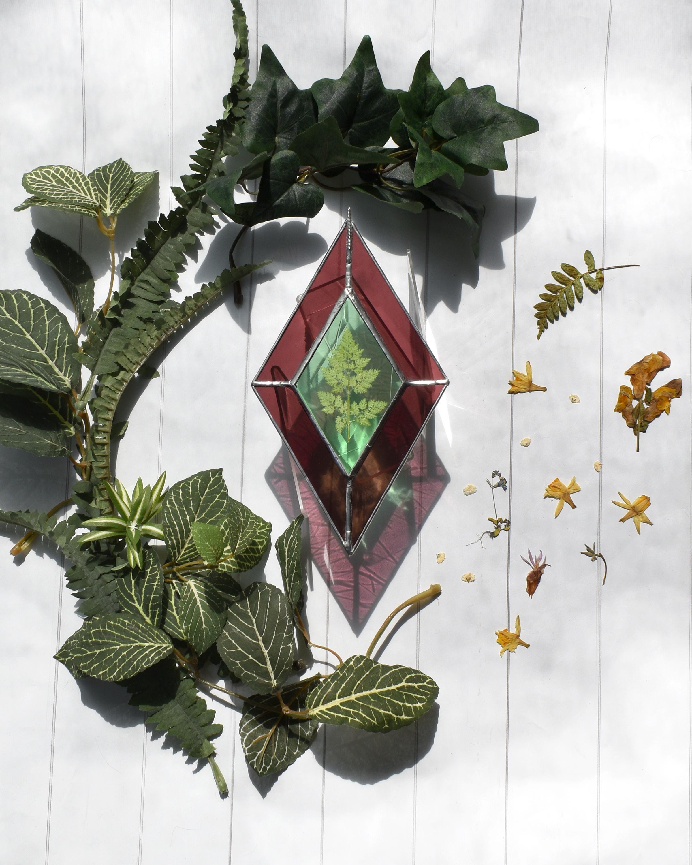 Pressed Yarrow Leaf in Diamond Bevel With Green Background & Deep Red Burgundy Frame